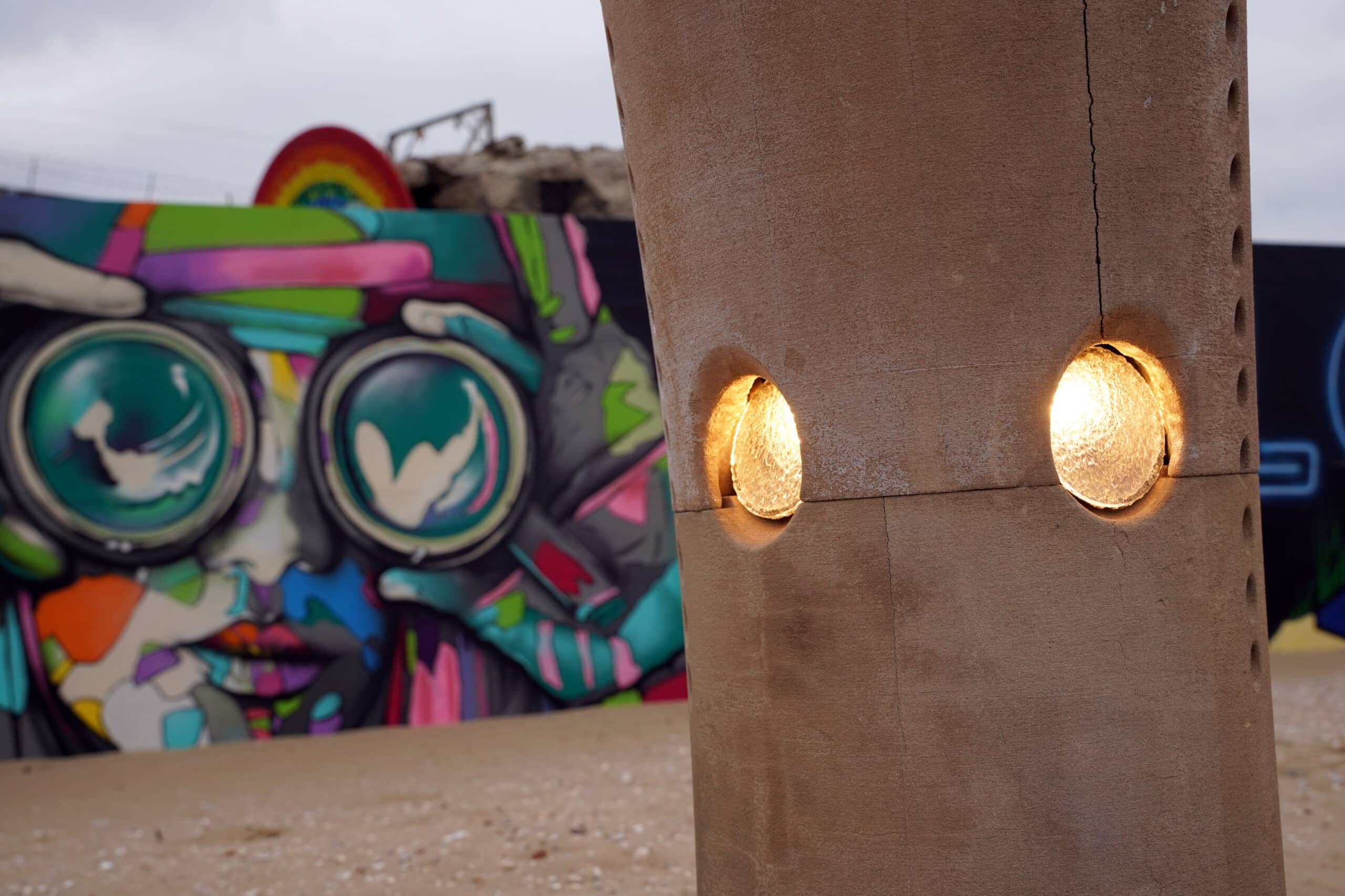 De installatie bestaat uit tweehonderd bewegende lichtpunten, vier sterke omgevingslampen en 64 gekleurde lichten. De zuil is 3D-geprint van strandzand en volledig recyclebaar, zodat het materiaal later kan terugkeren naar het strand.